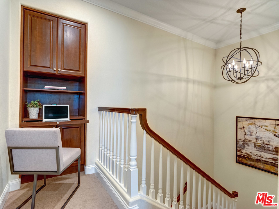 This beautiful two-story condominium is part of the Carabela community, located in the heart of Playa Vista. Enter through a gated entry, where youre greeted by a flowing fountain and meticulously maintained landscaping. This two-bedroom and two-and-a-half-bathroom unit features gorgeous wood floors throughout the entry and living area, a built-in media center, an elegant fireplace, and interior wood shutters. Off the living room, the kitchen is outfitted with stainless steel appliances and has a dining space with easy access to a patio for outdoor dining. Completing the first floor an in-unit washer-dryer and powder room. Upstairs, the master bedroom showcases a large walk-in closet and an en suite bathroom featuring a spa-like tub, double vanity sink, and white tile flooring. The large second bedroom comes with an attached bathroom with a shower and bathtub. Each bedroom has access to a spacious second-floor balcony. Home also features built-in desk at the top of the stairs creating perfect work from home office. You can enjoy countless amenities in this desired Playa Vista community, including parks, pools, a spa, and a fitness center. Its quintessential southern California living with walkable restaurants, parks, and movie theaters. Plus, its within a mile to the beach!