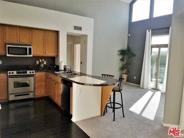 Spectacular Top Floor 2Bd + 2Bath condo with high ceilings and windows that allow rooms to bath in light, and showcase brilliant open skies above living room, kitchen and dining rooms. From this premiere SW-facing end unit, you'll enjoy bluff and tree top views, and the glorious glow of evening sunsets throughout. An end unit sharing only one wall connection wall. Bedrooms are situated on either side of living room, and have access to large scenic balcony sitting high above courtyard and fountain. Features upscale kitchen, eat at bar, washer and dryer, central heat/air, and two large walk in closets. The unit comes with two separate parking spaces, one with outlet for an electric vehicle. Centrally located just ½ a block from Centerpoint Club, and Concert Park shops, and includes access to all the entertainment and amenities that Playa Vista has to offer including pools, spa, clubhouse, fitness center, theatres, and dining