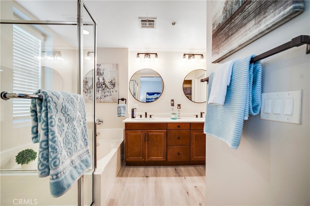 Live the upscale Playa Vista lifestyle in the heart of it all! Enjoy this beautiful top floor home, located across from Concert Park, with street-level shopping and dining all around! With a view of one of several lush courtyards, you enter into the living and formal dining areas, finished with Maple hardwood floors, creating a sense of continuity throughout the main level. The open concept floorplan is ideal for everyday living, as well as entertaining family and friends. The chef-style kitchen features warm, dark, wood cabinetry, granite surfaces, stainless appliances and custom tile backsplash. The kitchen opens to a casual dining area, which could also accommodate a workspace for those now working from home! The outdoor balcony, just off the kitchen, is the perfect place for your morning cup of coffee or your favorite beverage after work! The main level is complete with a remodeled half bath featuring new crisp white cabinetry, marble countertop and new fixtures. The entire home has been freshly painted in a warm, contemporary color. Downstairs you'll find a spacious flex space perfect for a home office, den or workout area. A full-size laundry closet makes doing laundry a breeze! The primary suite is the perfect place to retreat to at the end of the day, and relax in your remodeled, spa-style bath. Features include a large soaking tub, separate shower and dual sink vanity. Remodeled with new wood-style vinyl flooring, contemporary mirrors, lighting and fixtures. A large walk-in closet with custom built-ins completes the suite. The flex space separates the primary bedroom from the secondary bedroom, with en-suite bath, offering the utmost privacy. The remodeled en-suite bath, features new wood-style vinyl flooring, lighting, fixtures and mirror. Fresh paint and new carpet in warm designer colors complete this level of living. Your two assigned, side-by-side premium parking spaces are located in a secured, subterranean garage. No sunscreen needed at Southern California's Silicon Beach, where numerous high-tech companies are located, just a short distance away! Enjoy access to The Resort and Center Pointe Club/Gym, nearby shopping, dog parks, as well as the weekly Farmer's Market! Take advantage of the hottest new shopping experience at The Runway Free Market. The Playa Vista distinctive lifestyle awaits! Run, don't walk to see this fabulous home! View the 3D Matterport at https://my.matterport.com/show/?m=nUPW12cQMHi