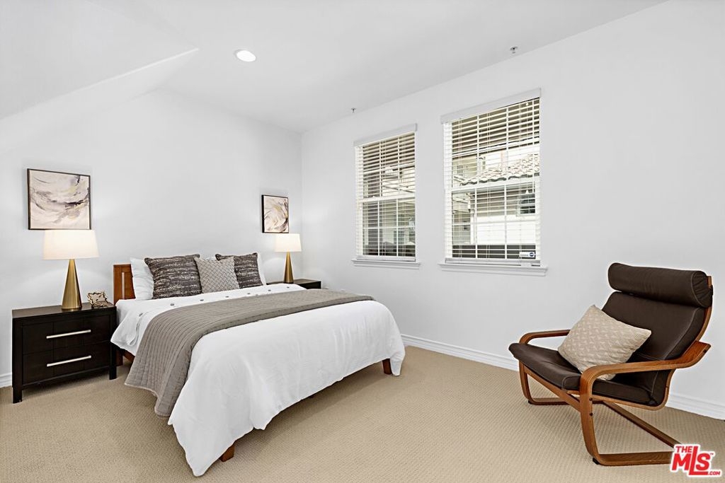 This top floor corner home in the sought after Villa d'Este community offers rare privacy, abundant natural light, and a spacious single level layout with a versatile loft. Fresh paint, new carpet, soaring vaulted ceilings, and no shared walls create an airy, open feel throughout.The living and dining areas flow seamlessly, framed by generous windows. The kitchen provides excellent storage, ample counter space, and a convenient desk nook. The loft above is ideal for a dedicated office or creative space with elevated hillside views. The primary suite features vaulted ceilings, a large walk-in closet, and an ensuite bath with a soaking tub and separate shower. A second bedroom and full guest bath complete the thoughtful floor plan. Additional perks include an interior storage closet, a large garage storage cage, and two side-by-side parking spaces. Villa d'Este is an intimate, beautifully maintained 39 home building with landscaped courtyards and an outdoor fireplace. HOA benefits include high speed fiber internet, cable TV, home security monitoring, and access to Playa Vista's resort style pools, fitness centers, and 29 parks. Located across from Crescent Park and moments from the CenterPointe Club, Whole Foods, Cinemark, Runway, and Playa Vista Elementary, this home offers exceptional convenience in one of Los Angeles' most desirable neighborhoods.