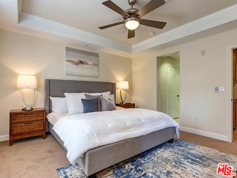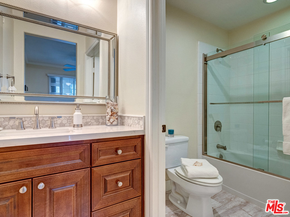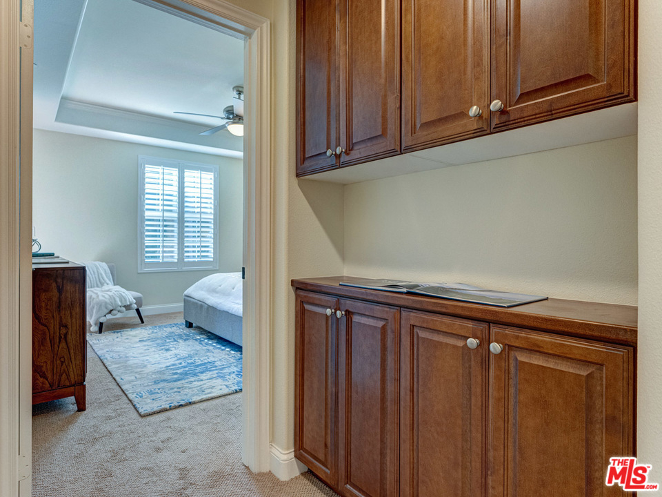 This beautiful two-story condominium is part of the Carabela community, located in the heart of Playa Vista. Enter through a gated entry, where youre greeted by a flowing fountain and meticulously maintained landscaping. This two-bedroom and two-and-a-half-bathroom unit features gorgeous wood floors throughout the entry and living area, a built-in media center, an elegant fireplace, and interior wood shutters. Off the living room, the kitchen is outfitted with stainless steel appliances and has a dining space with easy access to a patio for outdoor dining. Completing the first floor an in-unit washer-dryer and powder room. Upstairs, the master bedroom showcases a large walk-in closet and an en suite bathroom featuring a spa-like tub, double vanity sink, and white tile flooring. The large second bedroom comes with an attached bathroom with a shower and bathtub. Each bedroom has access to a spacious second-floor balcony. Home also features built-in desk at the top of the stairs creating perfect work from home office. You can enjoy countless amenities in this desired Playa Vista community, including parks, pools, a spa, and a fitness center. Its quintessential southern California living with walkable restaurants, parks, and movie theaters. Plus, its within a mile to the beach!
