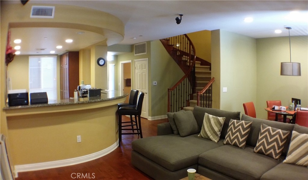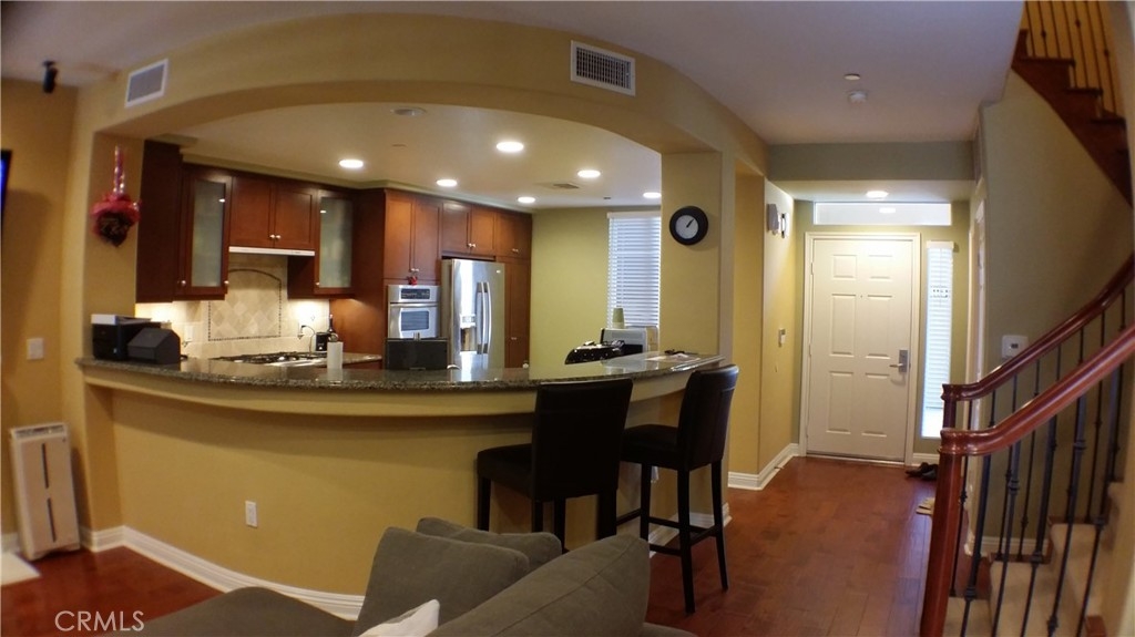 Stylish 2bd/2.5ba condo with hardwood floor throughout the downstairs & carpet upstairs’ bedrooms. Enjoy entertaining in this open concept layout with fireplace and Boss surrounding sound system, 2 large, covered balcony off the living room (1st floor) & master suite (2nd floor). Gourmet Kitchen with wrap around Breakfast Bar, SS Appliances & spacious Cabinet Space. Follow the curved staircase up to the 2nd bedroom with its own suite bathroom & closet. Across the hall is the Master Suite which boasts a walk-in closet, separate shower enclosure & bathtub. Conveniently located upstairs the laundry room features built in cabinetry and a washer & dryer. 2 gated subterranean parking space with electric vehicle charging station. HOA Incl. basic internet, water, 24hr Gym & Resort like amenities such as Pools, Spa.