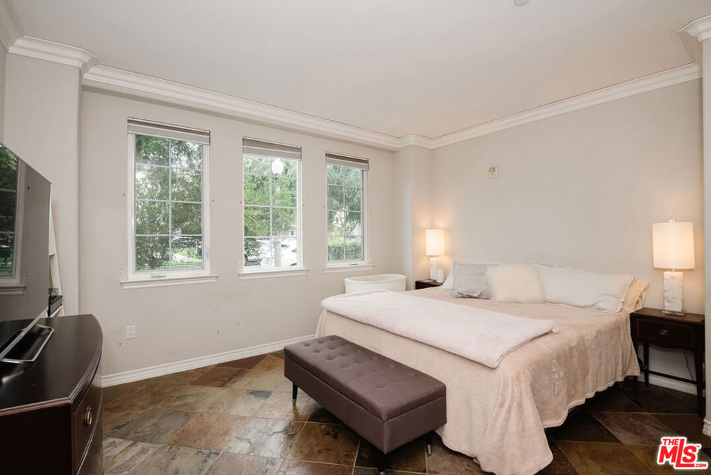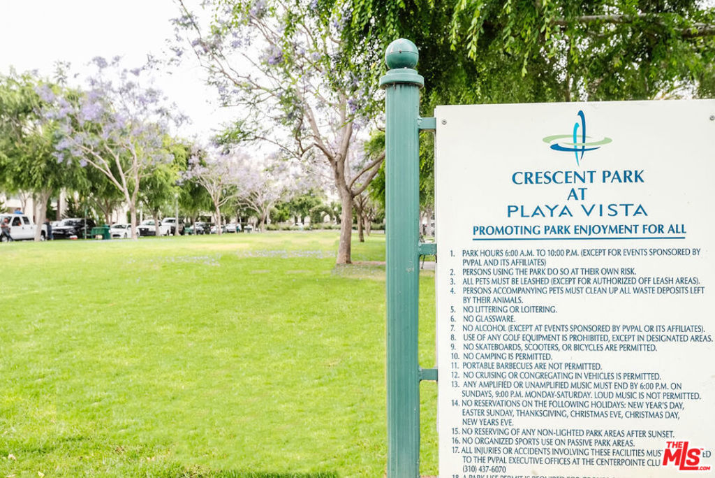 Stunning Villa d'Este single level home in Playa Vista with peaceful park views from almost every window! This south west facing corner home without any adjoining walls offers two bedrooms and two bathrooms spread over 1370 square feet. Wonderful natural light plus views looking out at Crescent Park give this home an amazing feel. Incredible floor plan with the spacious living and dining room opening up to the large balcony. Office nook off of the kitchen was replaced with extra kitchen cabinetry, bar area and wine fridge. Beautiful slate flooring and crown molding throughout. Side by side parking with extra storage in the subterranean parking garage. Two blocks to the highly ranked Playa Vista Elementary School and across the street from the Playa Vista CenterPointe Club's gym, pool and spa. Nearby, Runway at Playa Vista is home to Whole Foods, Movie Theater, restaurants and more. Includes access to the new Resort, a state of the art club with gorgeous gym and pool.
